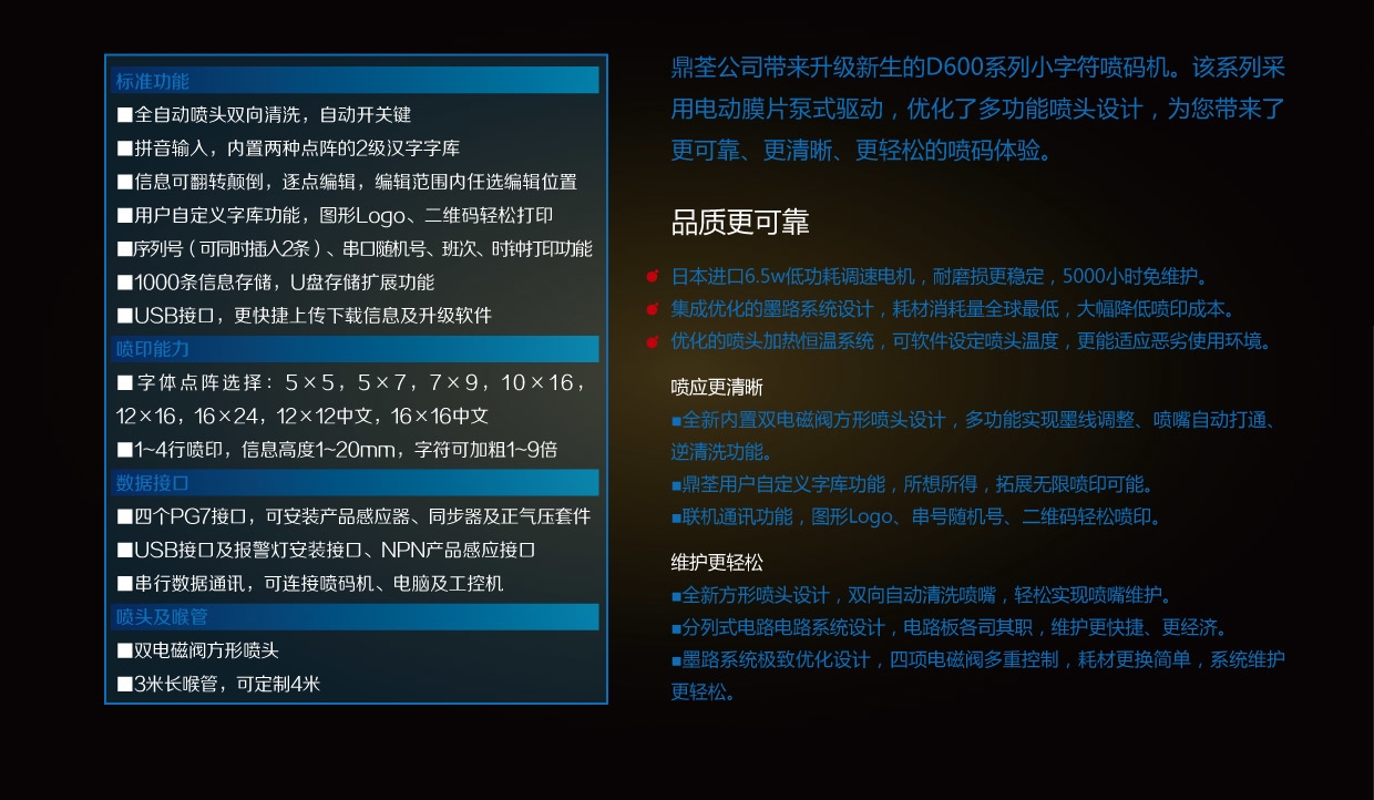 鼎荃公司帶來升級新生的D600系列小字符噴碼機。該系列采用電動膜片泵式驅(qū)動,優(yōu)化了多功能噴頭設(shè)計,為您帶來了更可靠、更清晰、更輕松的噴碼體驗。